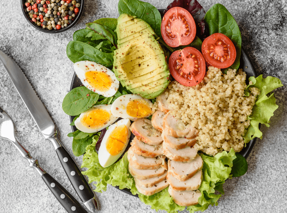 - A tányér negyede: Minőségi fehérjeforrás (csirkehús, hal, tofu, hüvelyesek), amely jóllakottságot biztosít.